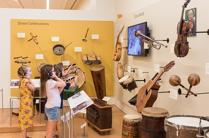Children use MIM’s headsets to listen to a video display in the Latin America Gallery’s Cuba exhibit.